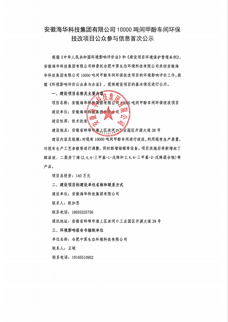 公示 | 安徽海華科技集團(tuán)有限公司10000噸間甲酚車間環(huán)保技改項(xiàng)目公眾參與信息首次公示